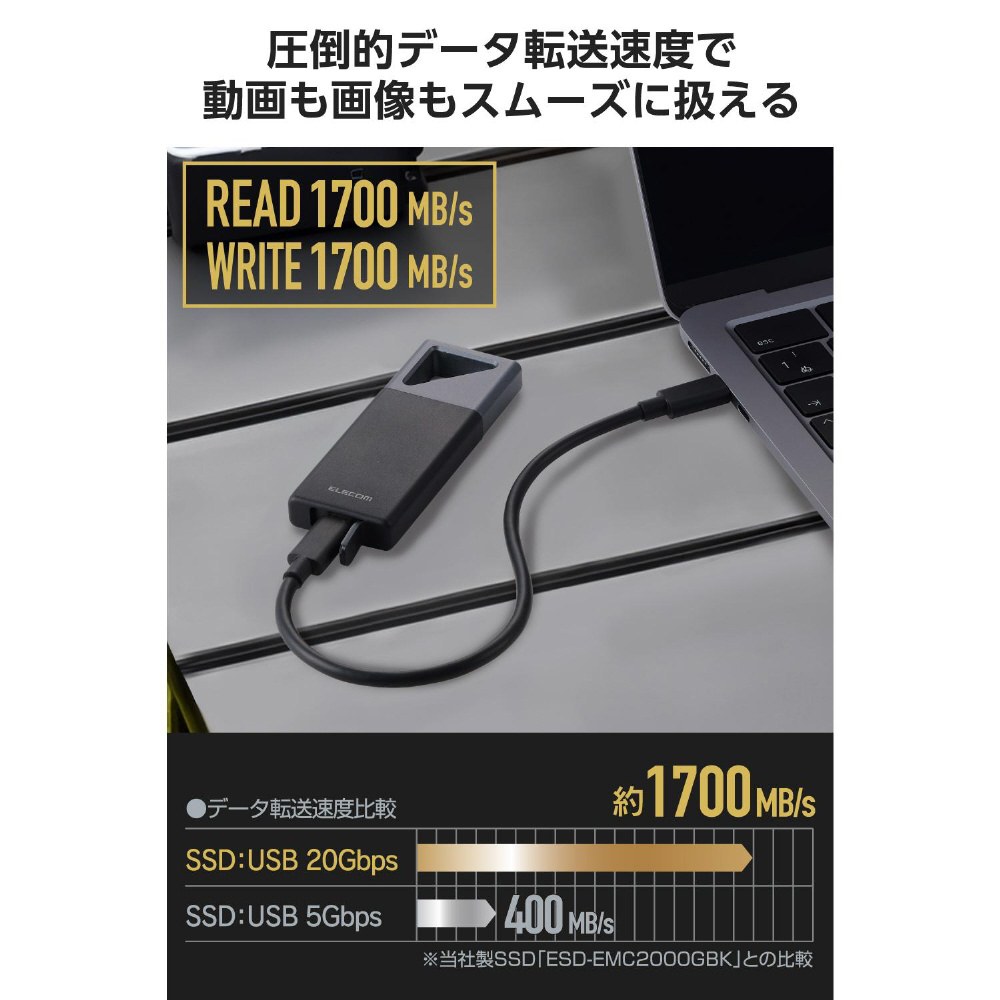 読み込み最大1700MB/s・書き込み最大1700MB/sの高速データ転送を実現する、USB 20Gbps(USB3.2(Gen2x2))外付けポータブルSSDです。