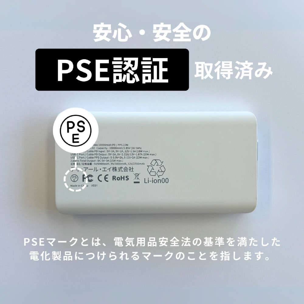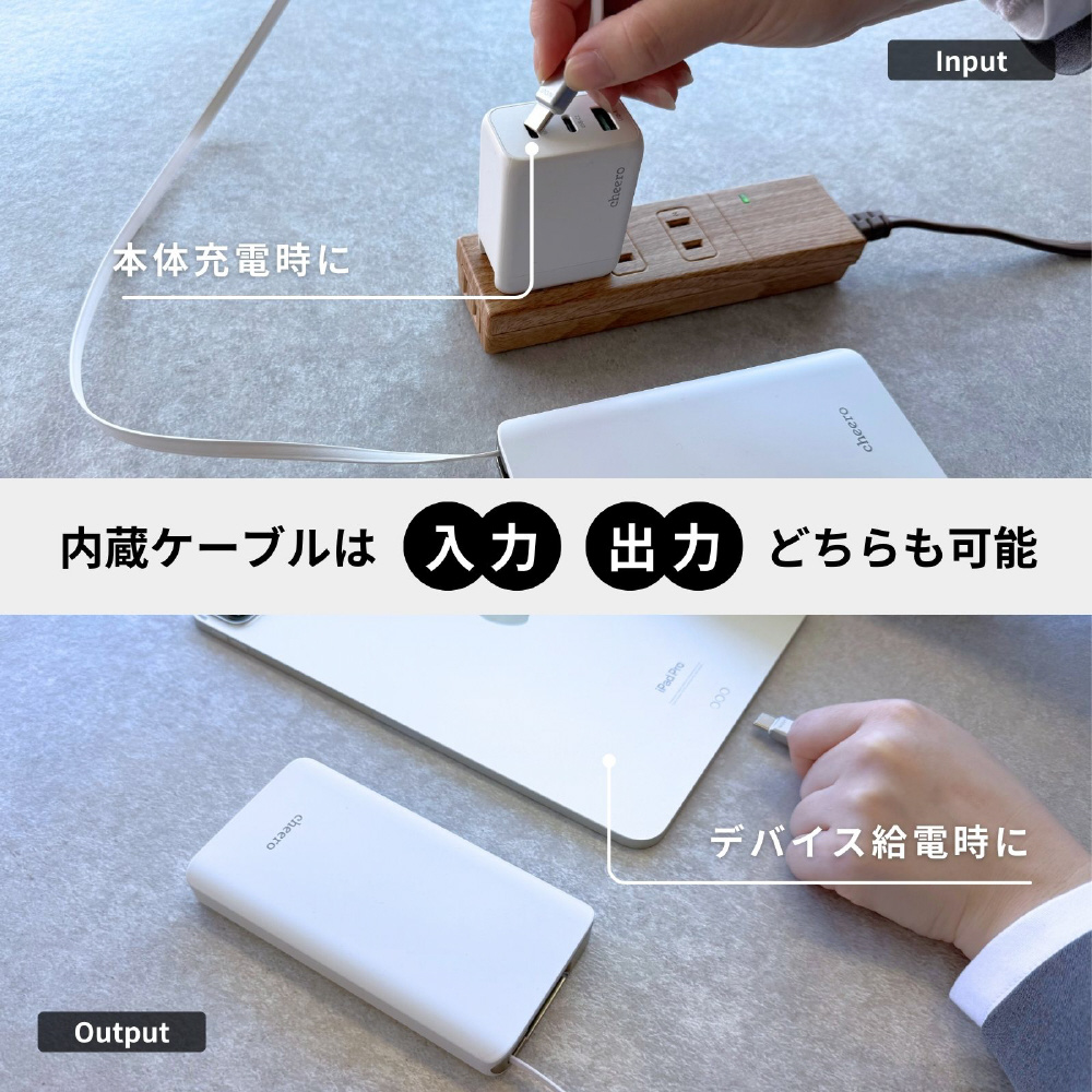 厚さ1.8cmで薄型ながら安心の大容量10000mAh。最大22W出力で急速充電対応。内蔵ケーブルと本体の出力ポートを使えば、2台同時充電も可能です。