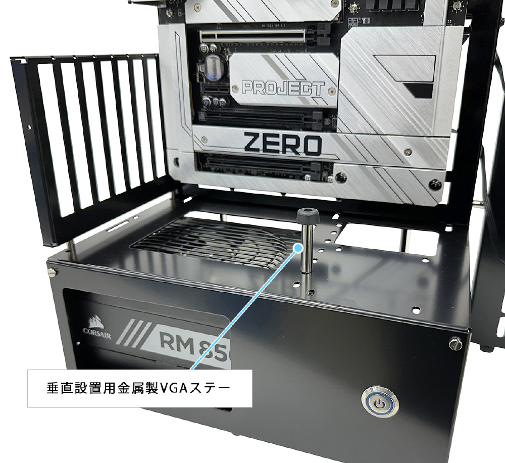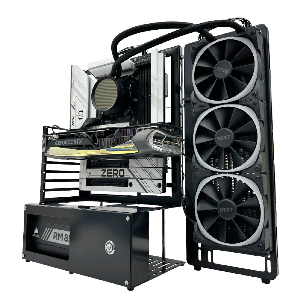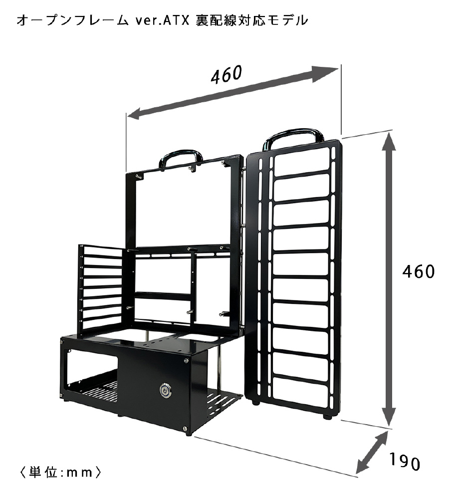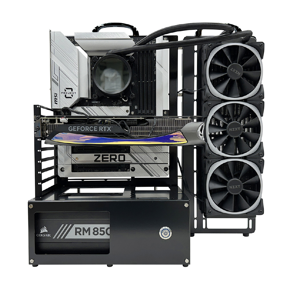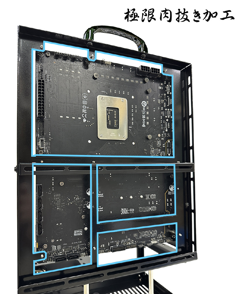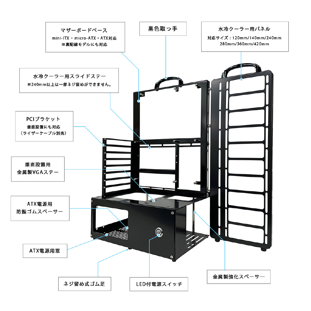 PCパーツの造形美を楽しむためのATX向けオープンフレームに更なる改良を加え、裏配線マザーボードにも対応した魅せるを極めた特別モデルです。フレームサイドには大型のラジエーター対応の水冷クーラー用パネル搭載で魅せる設置が可能です。