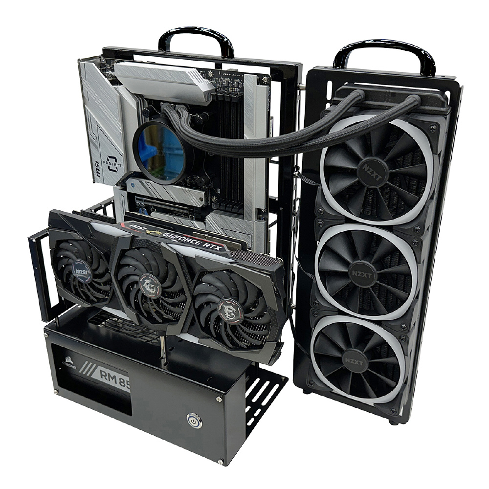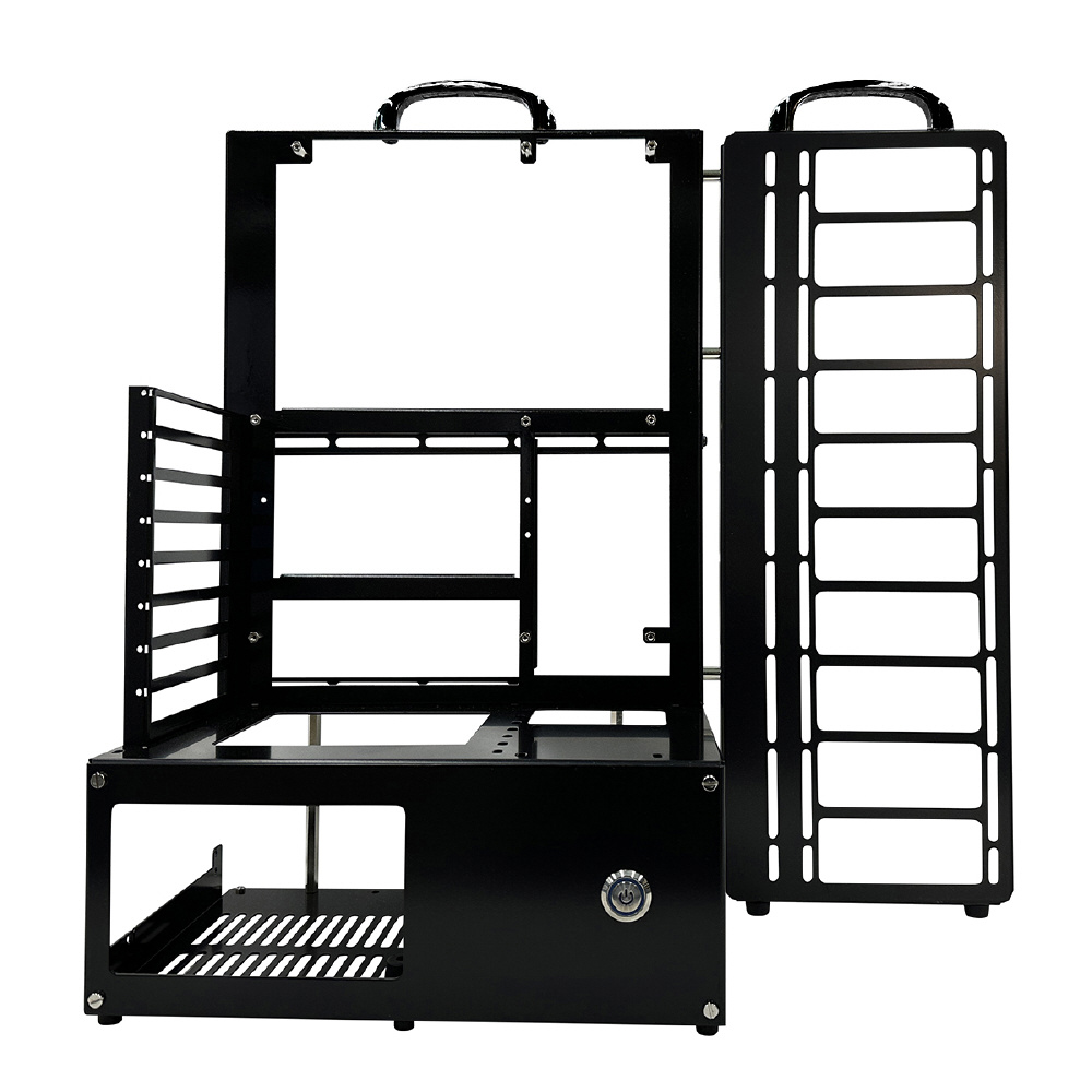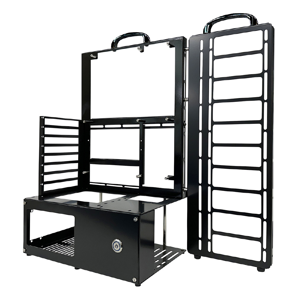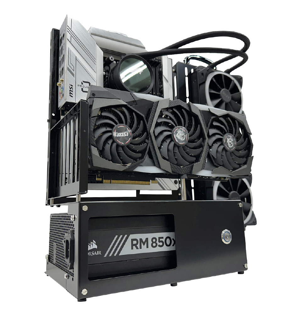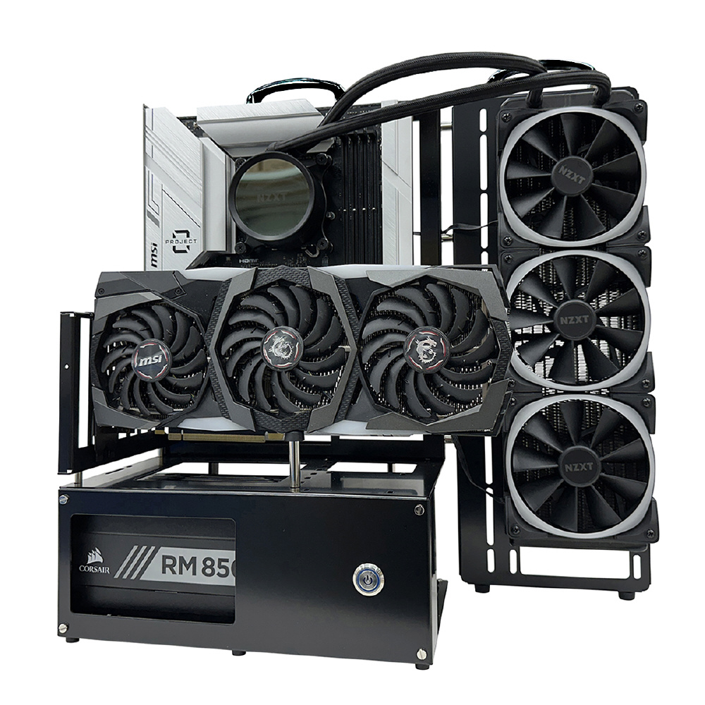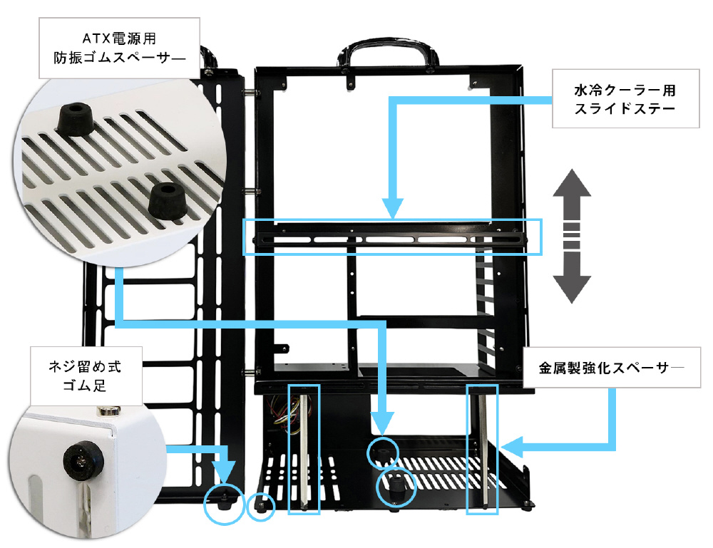 PCパーツの造形美を楽しむためのATX向けオープンフレームに更なる改良を加え、裏配線マザーボードにも対応した魅せるを極めた特別モデルです。フレームサイドには大型のラジエーター対応の水冷クーラー用パネル搭載で魅せる設置が可能です。