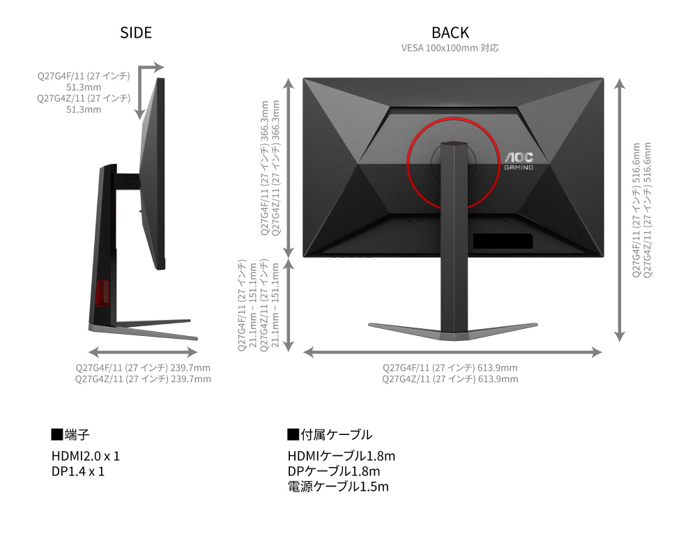 | 付属品 | 電源ケーブル1.5m、HDMIケーブル1.8m、Displayportケーブル1.8m、スタンド、ベース、保証書、ケーブル付属リスト |