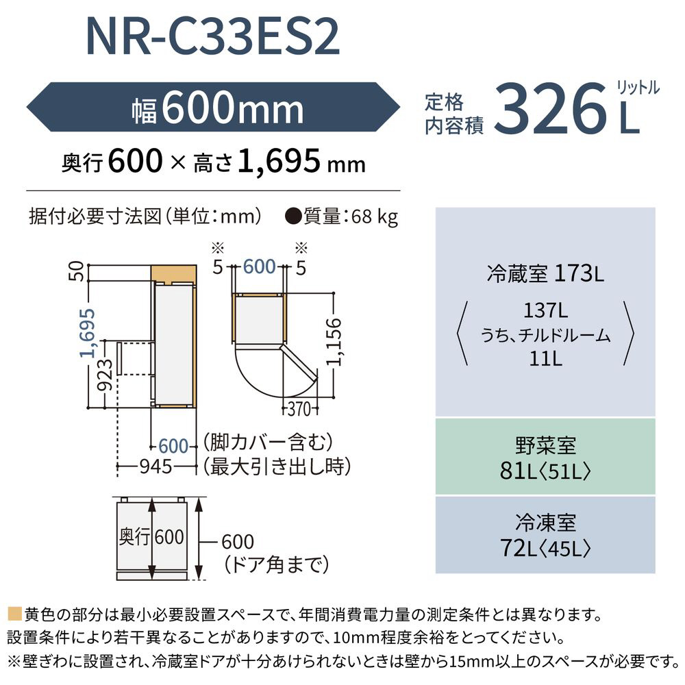 冷蔵庫 ESタイプ マットベージュ NR-C33ES2-C [60cm /326L /3ドア /右開きタイプ /2025年] 【基本設置料金セット】