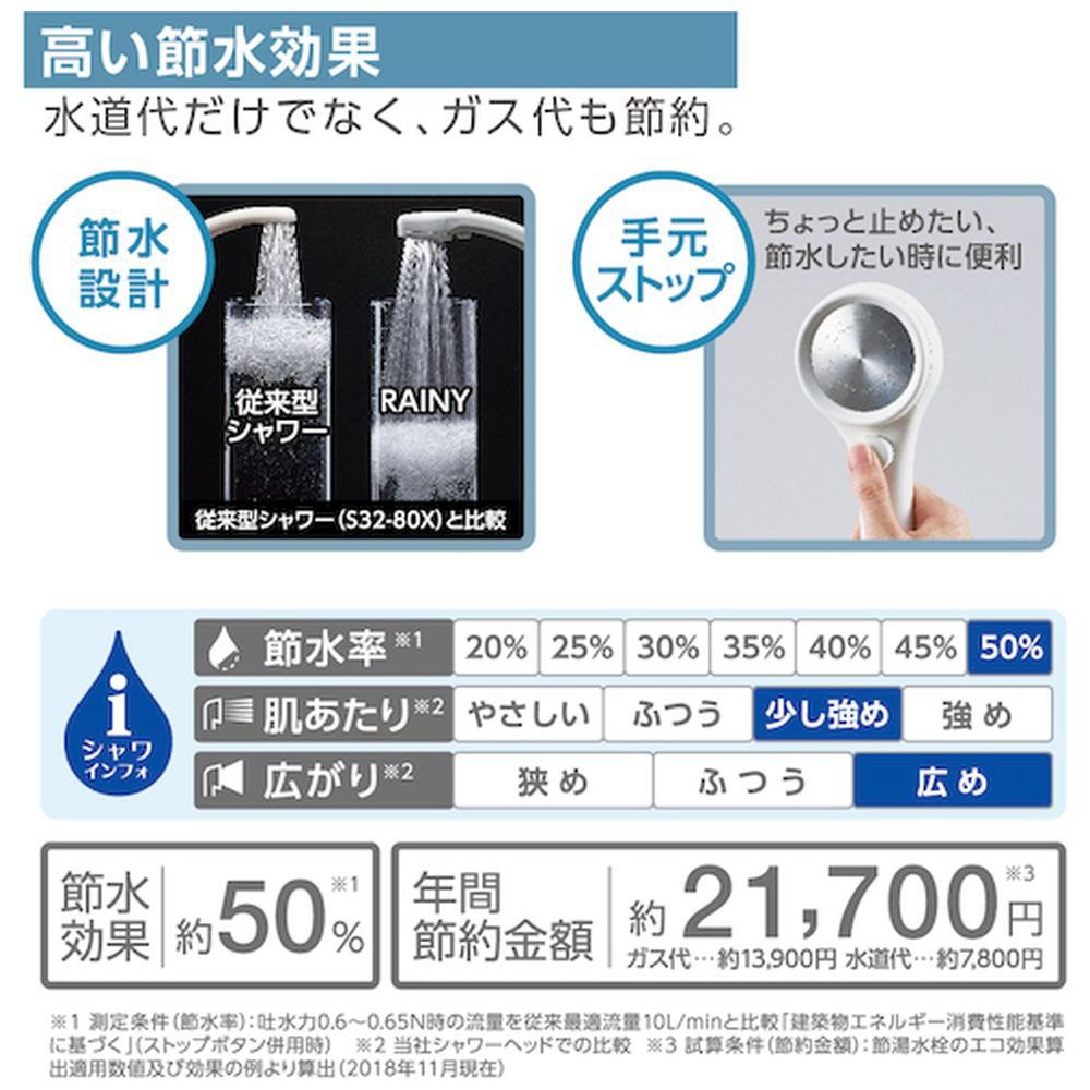 ■節水効果約50%: 節水効果のあるシャワーヘッドです。