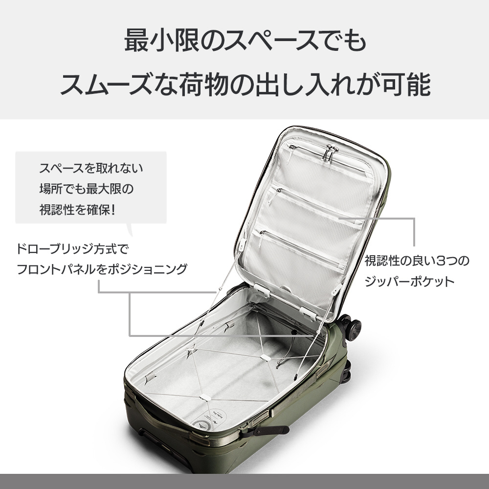 2017年のデザイン案から試行錯誤を経て完成した、唯一無二の4輪ダブルキャスターローリングケースです。内側の収納を犠牲にしないSlimDrive?(スリムドライブ)ハンドル構造により、コンパクトな外観ながらも34Lの容量を確保。ケース外側のエクスパンションジッパーを開ければ、容量を5L増やせます。