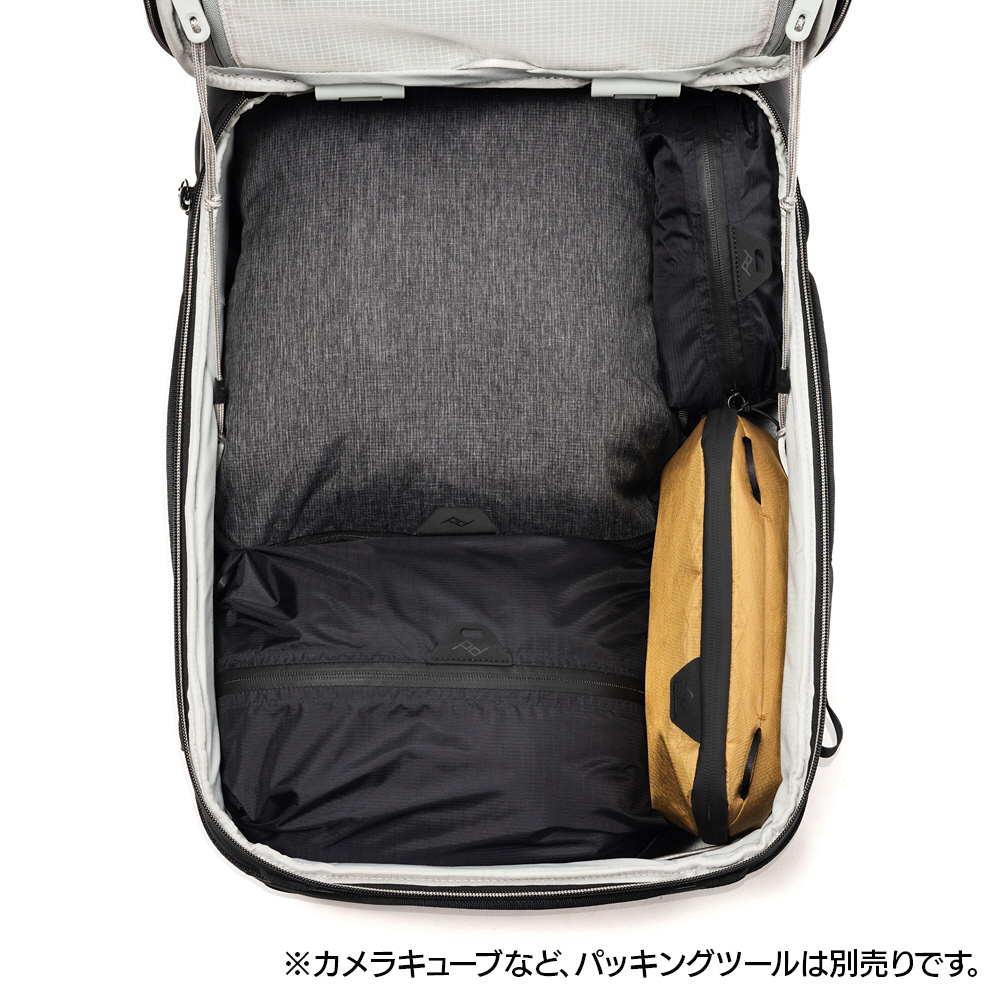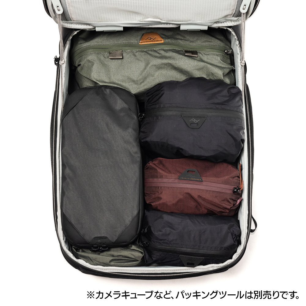 バリエーション豊かなカメラキューブやパッキングキューブ、各種ポーチなどを組み合わせて、衣類や撮影機材まであらゆる荷物を整理しながら収納可能です。