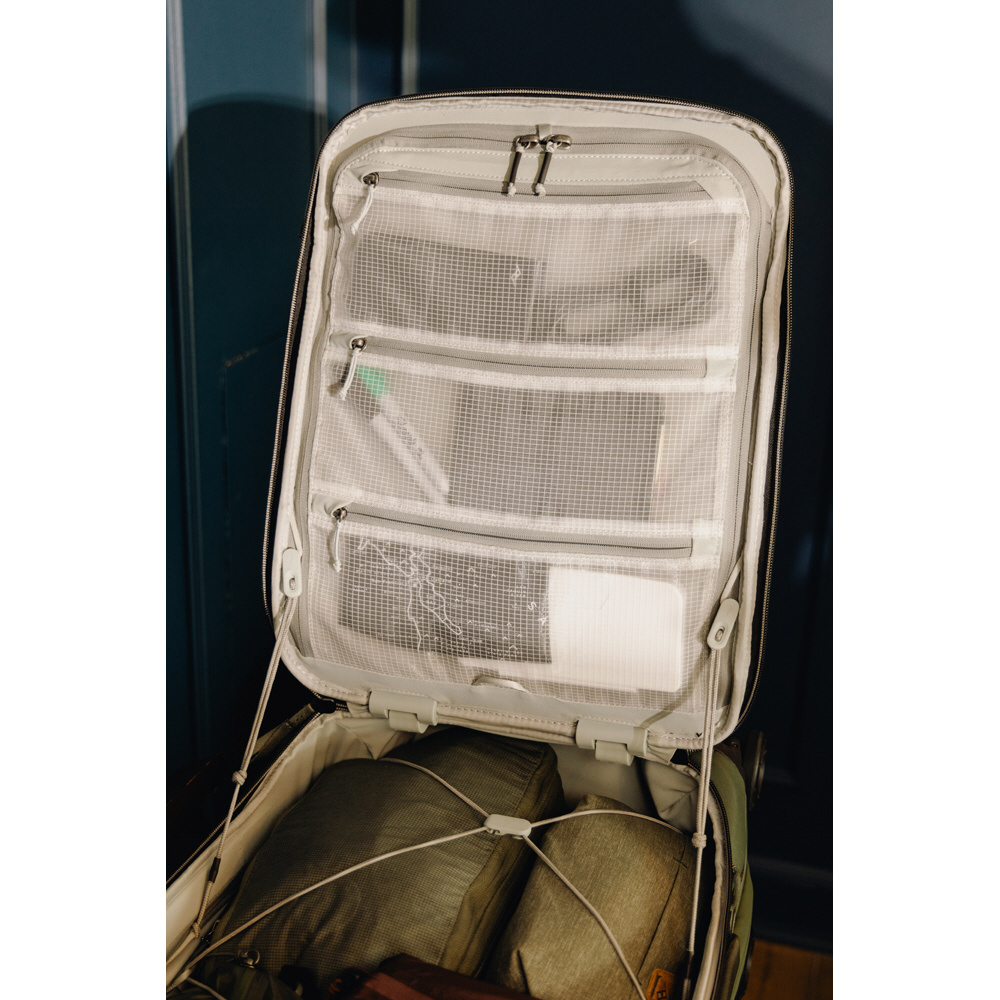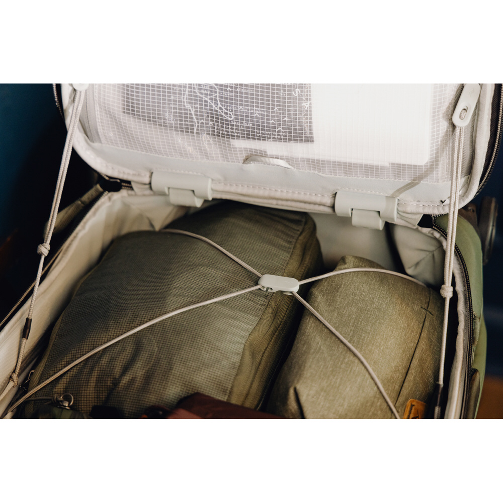 超高分子量ポリエチレン(UHMWPE)繊維を使ったコードフックシステムを採用し、荷物の量に合わせて中身を固定。大きさの異なるポーチやキューブを収納しても、移動中にバッグの中身がずれにくい工夫を施しています。