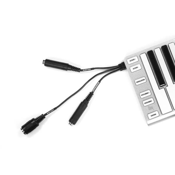付属のXcableアダプターを使用することで、5ピンDIN MIDI出力および1/4インチ端子(エクスプレッションペダル/サステインペダル用)を追加できます。これにより、Xkeyを従来のMIDI機器やフットペダルと連携させた本格的なパフォーマンスや制作環境が構築可能になります。