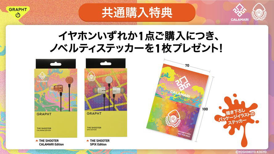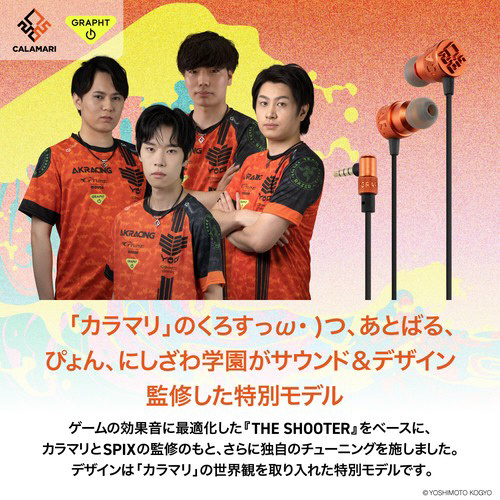 「よしもとゲーミング」シューティング部門所属の、くろすっω・)つ、あとばる、ぴょん、にしざわ学園の4名によるチーム「よしもとゲーミング カラマリ」と、ダイナモン、メロンによる「SPIX」の計6名がサウンドとデザインを監修したゲーミングイヤホンです。