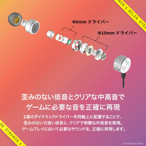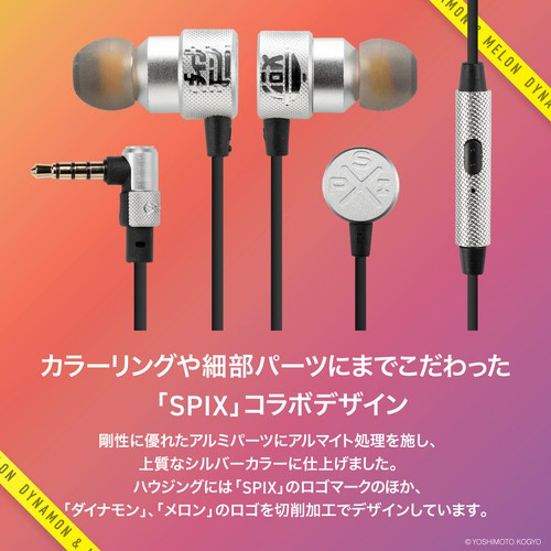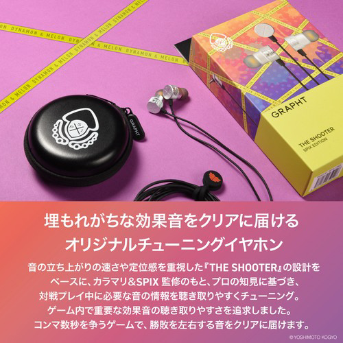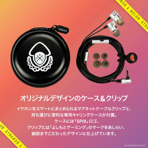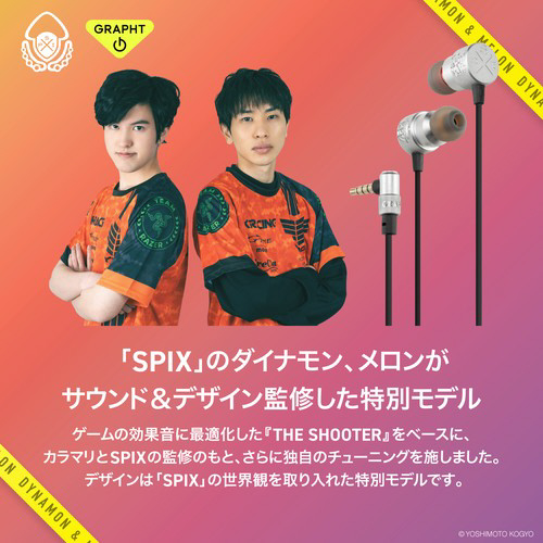 「よしもとゲーミング」シューティング部門所属の、くろすっω・)つ、あとばる、ぴょん、にしざわ学園の4名によるチーム「よしもとゲーミング カラマリ」と、ダイナモン、メロンによる「SPIX」の計6名がサウンドとデザインを監修したゲーミングイヤホンです。
