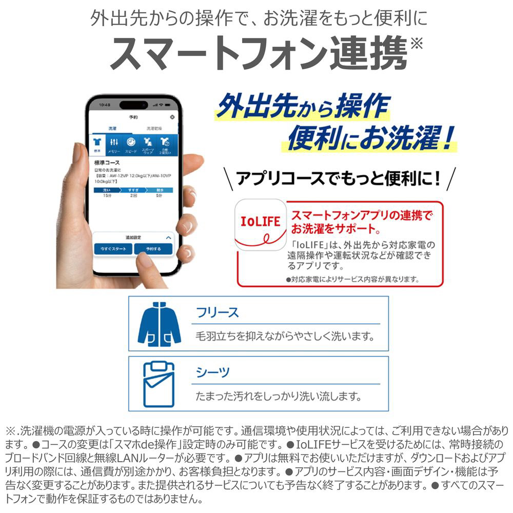 | コース | 標準、メモリー(10kg)、スピード(5kg)、しわ軽減(3kg)、おしゃれ着(3kg)、自動2度洗い(3kg)、毛布(4.7kg)、部屋干し(5kg)、アプリ、槽洗浄、槽・風乾燥 |