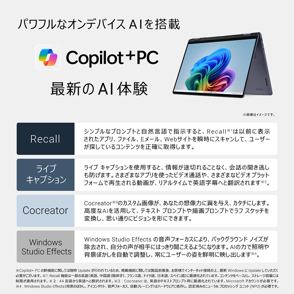 ※Recall機能は一部の言語に最適化されています。コンテンツをベースとし、ストレージ容量には制限が適用されます。 Cocreatorは、英語のテキストプロンプト用に最適化されています。Microsoftアカウントが必要です。Windows Studio Effectsはハードウェアに依存し、認定済みのNPUが必要です。