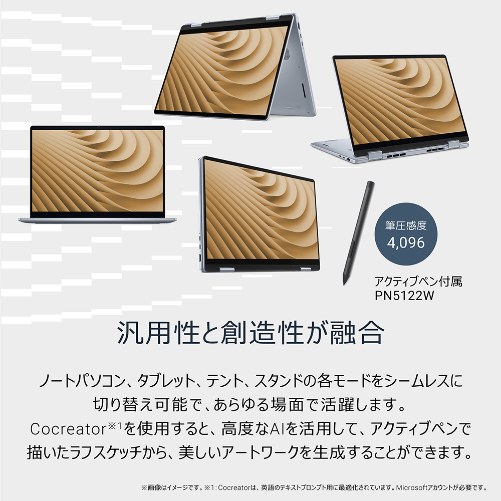 ※Recall機能は一部の言語に最適化されています。コンテンツをベースとし、ストレージ容量には制限が適用されます。 Cocreatorは、英語のテキストプロンプト用に最適化されています。Microsoftアカウントが必要です。Windows Studio Effectsはハードウェアに依存し、認定済みのNPUが必要です。
