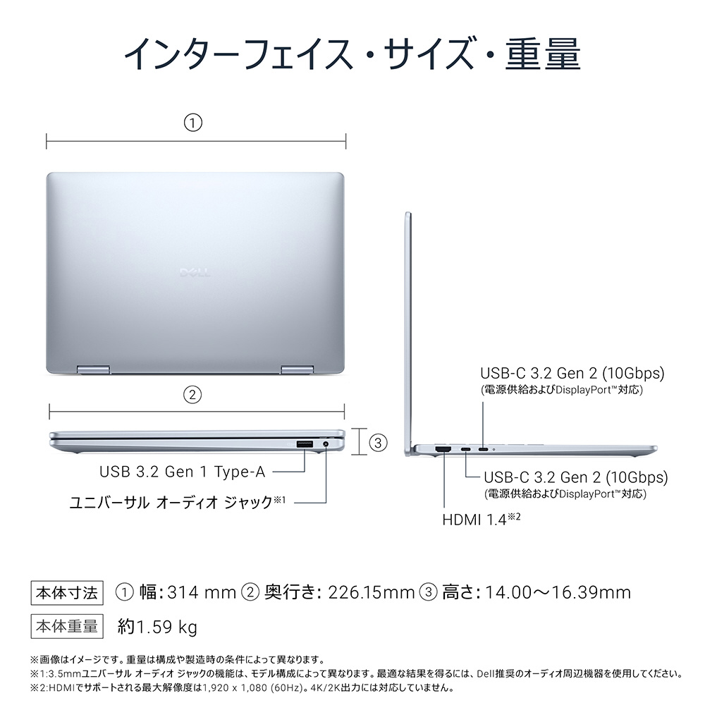 360度回転を含む4つのモードを自由に切り替えられるだけでなく、高品質なビジュアル、オーディオも備えています。広々とした14インチFHD+タッチ ディスプレイで鮮やかな色彩とシャープなディテールを楽しんだり、混雑した環境でもスピーカーフォン並みのクリアかつ大音量のオーディオでお気に入りのコンテンツを楽しんだりできます。Dell ComfortViewで目の負担を軽減することができ、長時間の作業も快適です。