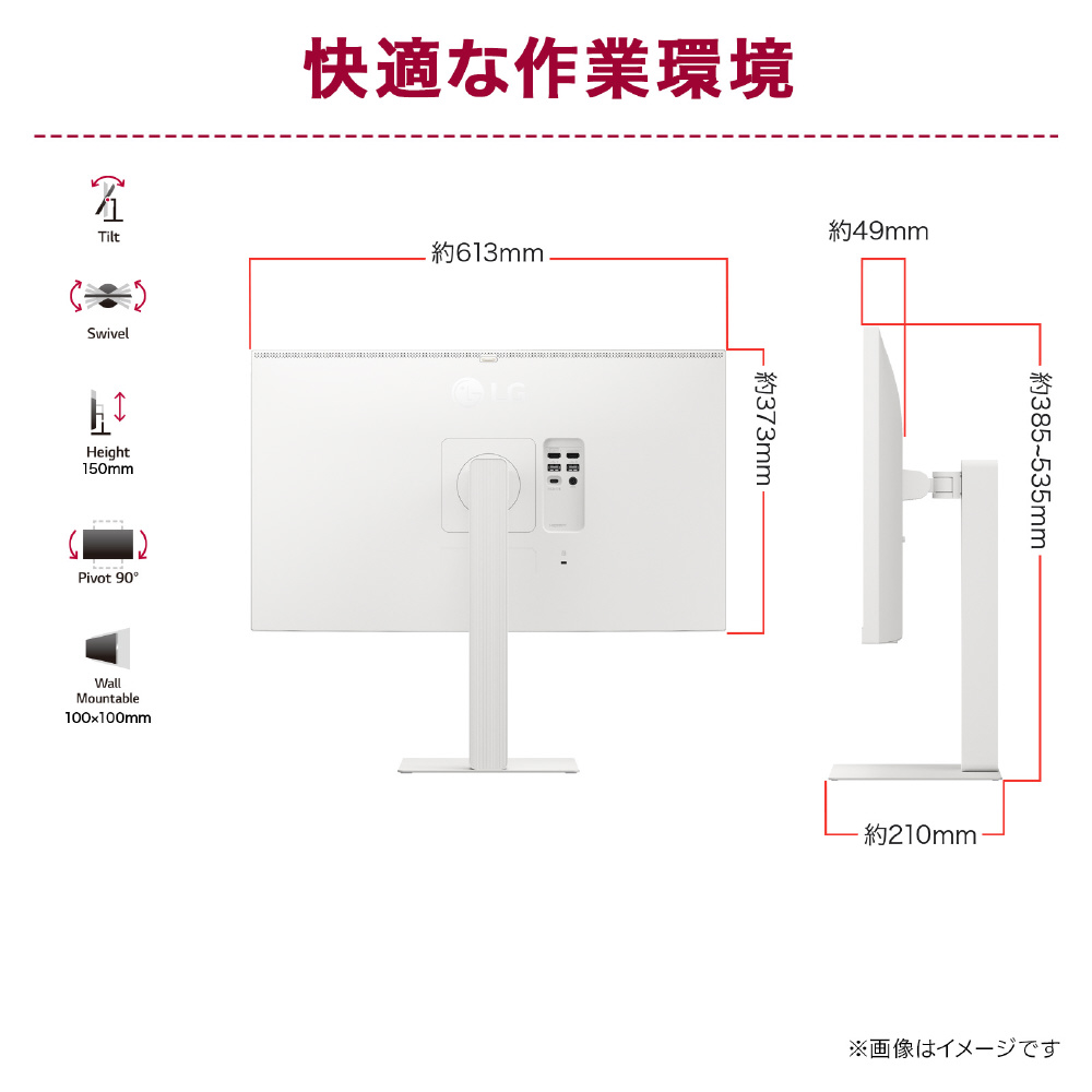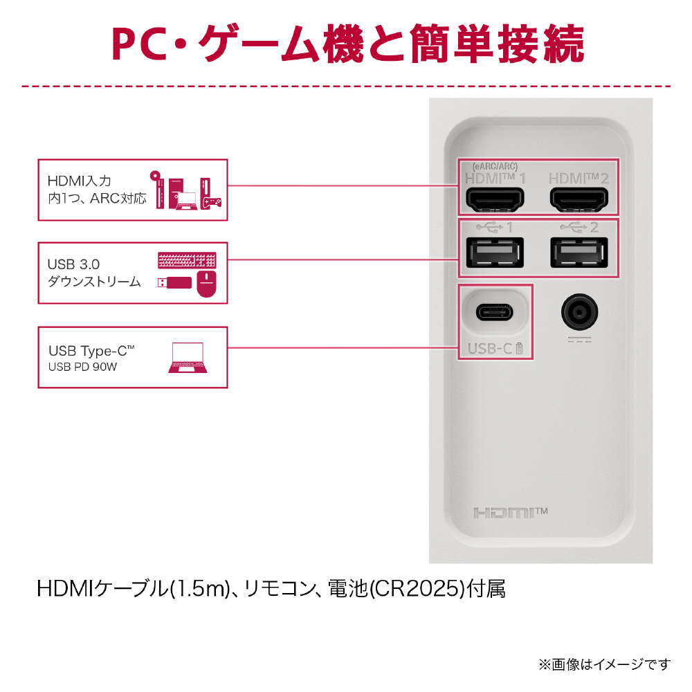 ケーブル1本で映像・音声信号、データ転送、給電*(65Wまで)が可能なUSB Type-C端子を搭載。お手持ちのノートパソコンも簡単にセットアップ。USB Type-C接続なら、作業をしながら、ノートパソコンの充電もできます。また、USBハブとして、モニターのUSB-A端子にUSB機器(マウスなど)を接続しておけば、接続したUSB機器をノートパソコンで使用できます。また、パソコンを接続していないときは、webOSの操作に使用できます。より少ないケーブルでデスク環境を構築できるので、デスク周りもスッキリきれい、デスク環境がより理想に近づきます。