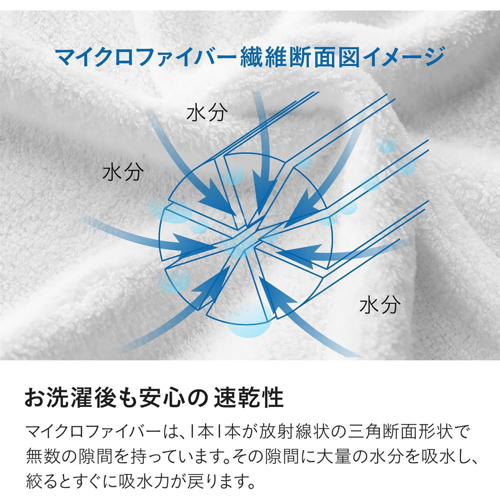 吸水力抜群のマイクロファイバー素材が、お風呂上がりの水分をしっかり吸収。抗菌+消臭加工を施しました。ふわふわでやわらかな肌ざわり。