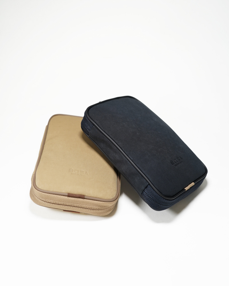 外装は縁にパイピングを施して端正な表情を持たせ、内部はフラップを片側のみにすることでシンプルでありながら、熊野筆の穂先をしっかりと守る構造です。