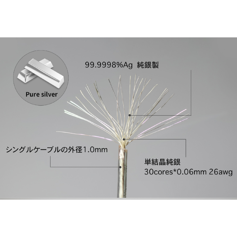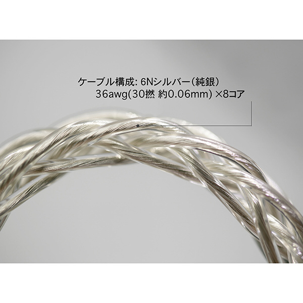 エントリーモデルながら純銀ケーブルを採用 6Nシルバー(純銀)36 awg(30撚り 約0.06mm)×8コアの本格的純銀線を採用 純銀線らしい煌びやかな高域が楽しめる非常に実用的な線材で入門用としても気軽に楽しめるものとなっております。