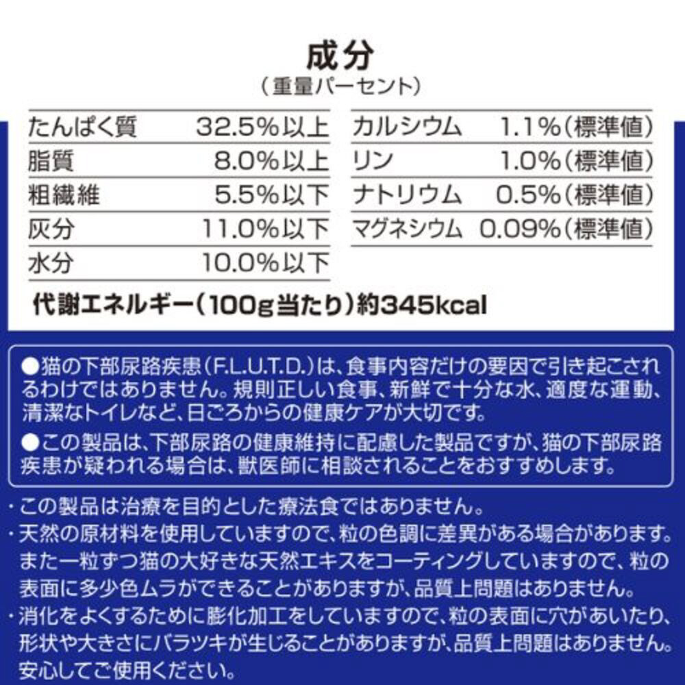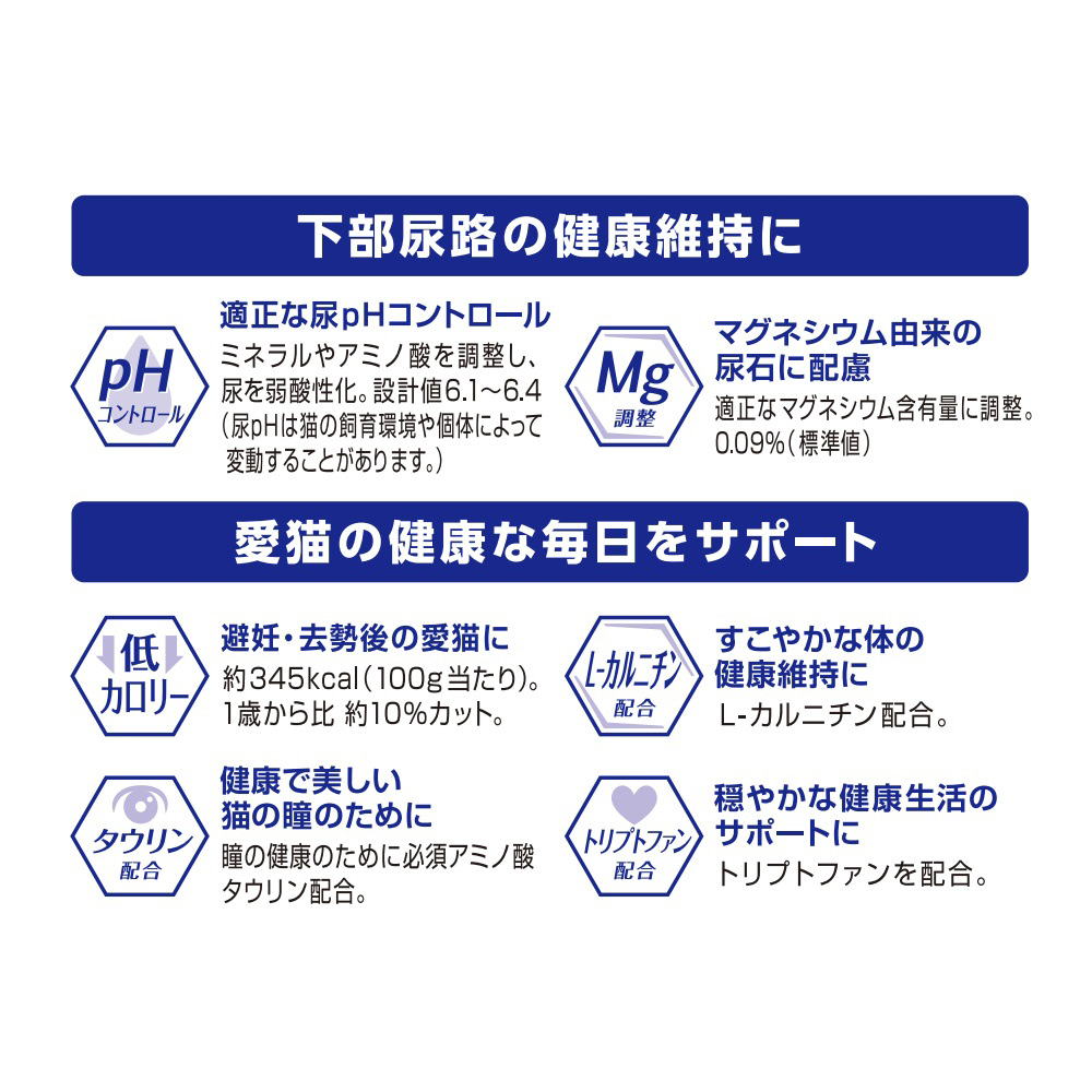 【無着色】この製品は、ペットフード公正取引協議会の定める分析試験の結果、「総合栄養食/全ライフステージ用」の基準を満たすことが証明されています。■適正な尿pHコントロール◇ミネラルやアミノ酸を調整し、尿を弱酸性化。◎設計値6.1〜6.4(尿pHは猫の飼育環境や個体によって変動することがあります。)■マグネシウム由来の尿石に配慮◇適正なマグネシウム含有量に調整。◎マグネシウム 0.09%(標準値)■避妊・去勢後の愛猫に◇約345kcal(100g当たり)◎1歳から比 約10%カット■すこやかな体の健康維持に◇L-カルニチンを配合。■健康で美しい猫の瞳のために◇瞳の健康のために必須アミノ酸タウリンを配合。■穏やかな健康生活のサポートに◇トリプトファンを配合。