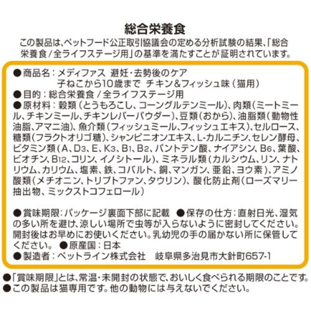 | 商品名 | ペットライン メディファス 避妊・去勢後のケア 子ねこから10歳まで チキン&フィッシュ味 150g |
