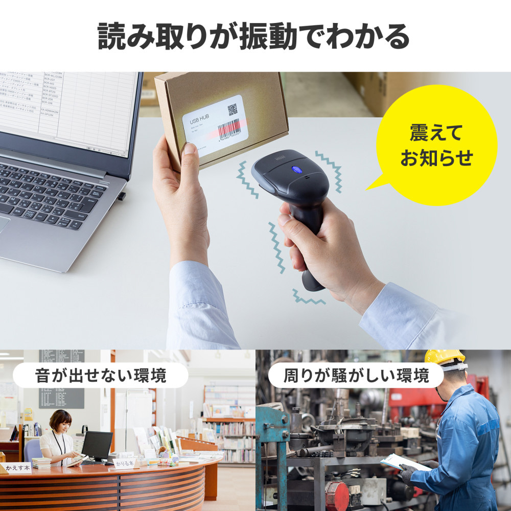3つの接続方式に対応し、多様な環境で使用可能なバーコードスキャナー。振動機能と充電クレードルで快適な運用をサポート。