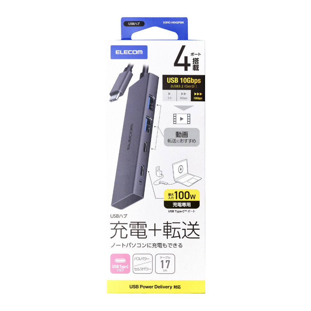 U3HC-H042PBK USB-C → USB-C+USB-A 変換ハブ (iPadOS/Mac/Windows11対応) ブラック [バス&セルフパワー /4ポート /USB 3.2 Gen2対応 /USB Power Delivery対応]