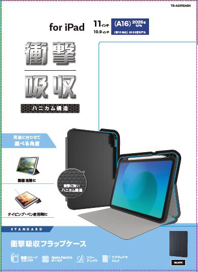 11インチ iPad(A16)、10.9インチ iPad(第10世代)用 フラップケース 衝撃吸収 Pencil収納 スリープ対応 ブラック TB-A25RSABK