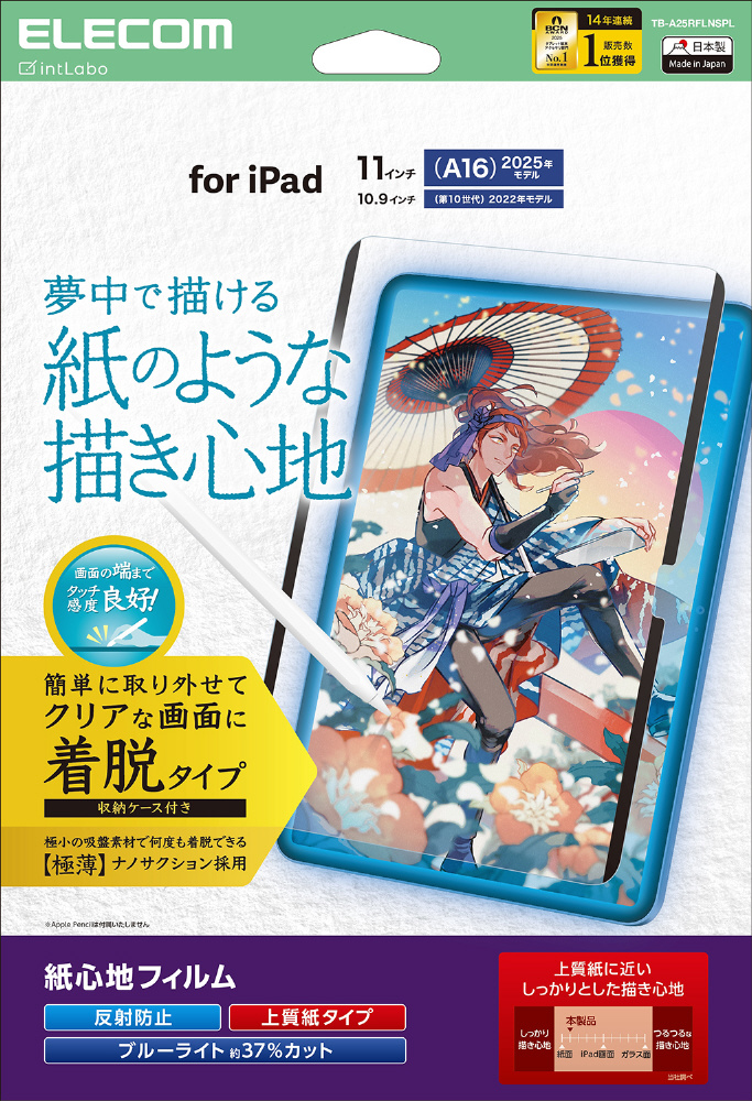 簡単に取り外せてクリアな画面に着脱タイプのペーパーライクフィルム。デジタルデバイスで絵を描く人や文字を書く人、すべてに“夢中になれる時間”を提供します。