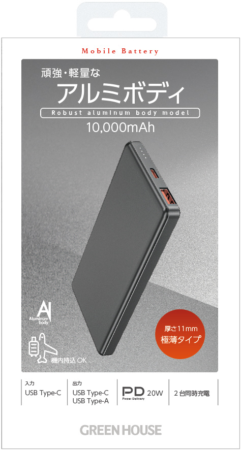 アルミ モバイルバッテリー PD20W 10000mAh シルバー GH-MB10PB-SV [USB Power Delivery対応 /2ポート]