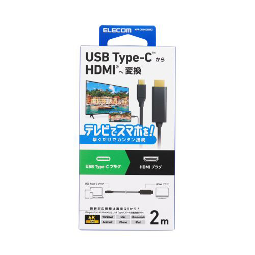スマートフォンやパソコンなどの映像をディスプレイなどに出力できる、USB Type-C(TM)ポートをHDMI(R)プラグに変換するケーブルです。HDMIポート搭載ディスプレイなどに映像を出力することができ、画面複製と画面拡張に対応しています。