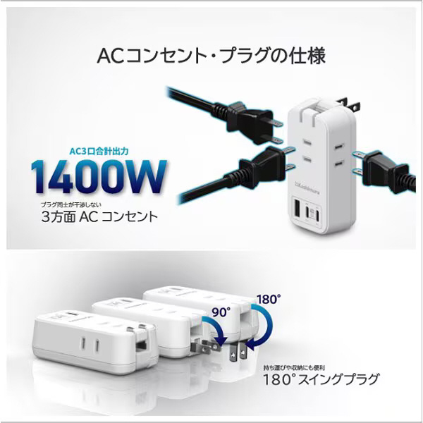 ACコンセントは3口合計1400Wまで対応しています。
