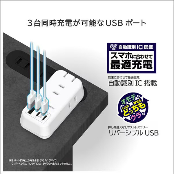 電源タップ AC3 USBA+C2 PD30W 自動識別 リバーシブル AC-065
