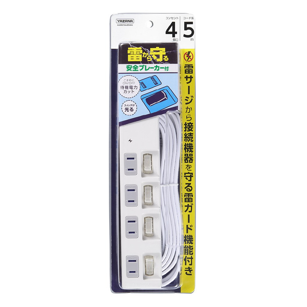 雷ガード付4個口節電タップ3m ホワイト H4BKS443WH 最大サージ電圧 6000V [5.0m /4個口 /スイッチ付き(個別)]