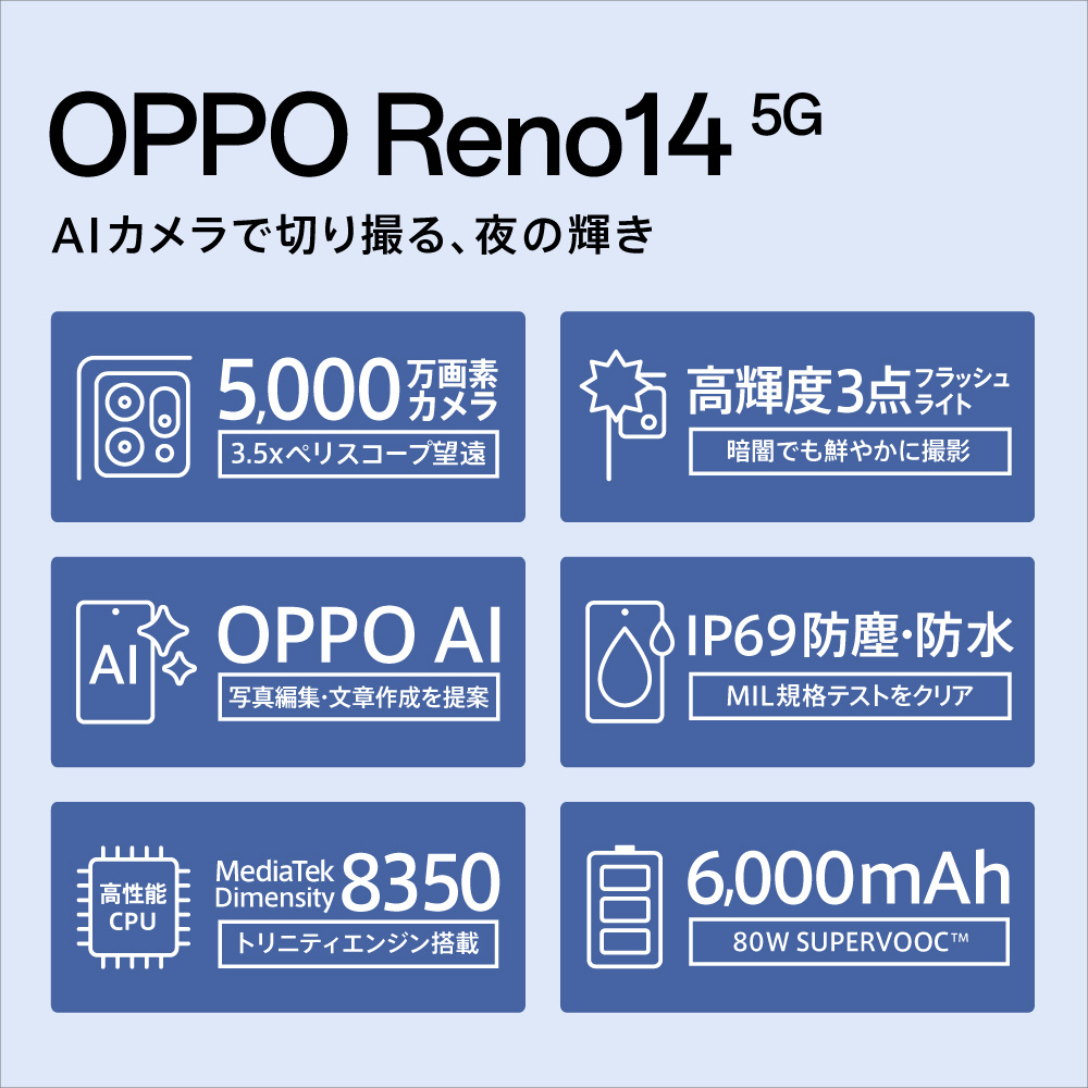 【SIMフリー】OPPO Reno14 5G ルミナスグリーン「CPH2737 LG」MediaTek Dimensity 8350 6.6インチ・メモリ/ストレージ:12GB/256GB nanoSIM ×2 eSIM対応【防水・防塵】 ルミナスグリーン