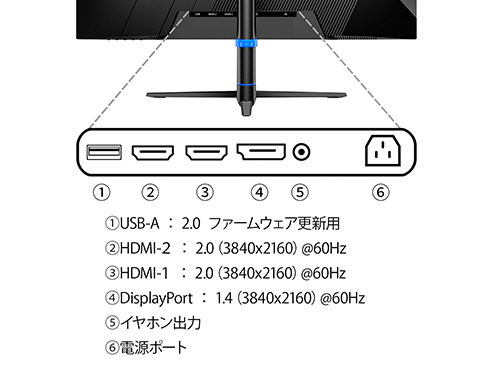 ■インターフェイスは、HDMI2.0 x2 (60Hz)、DisplayPort1.4 x1 (60Hz)を装備し、様々な機器との接続が可能です。