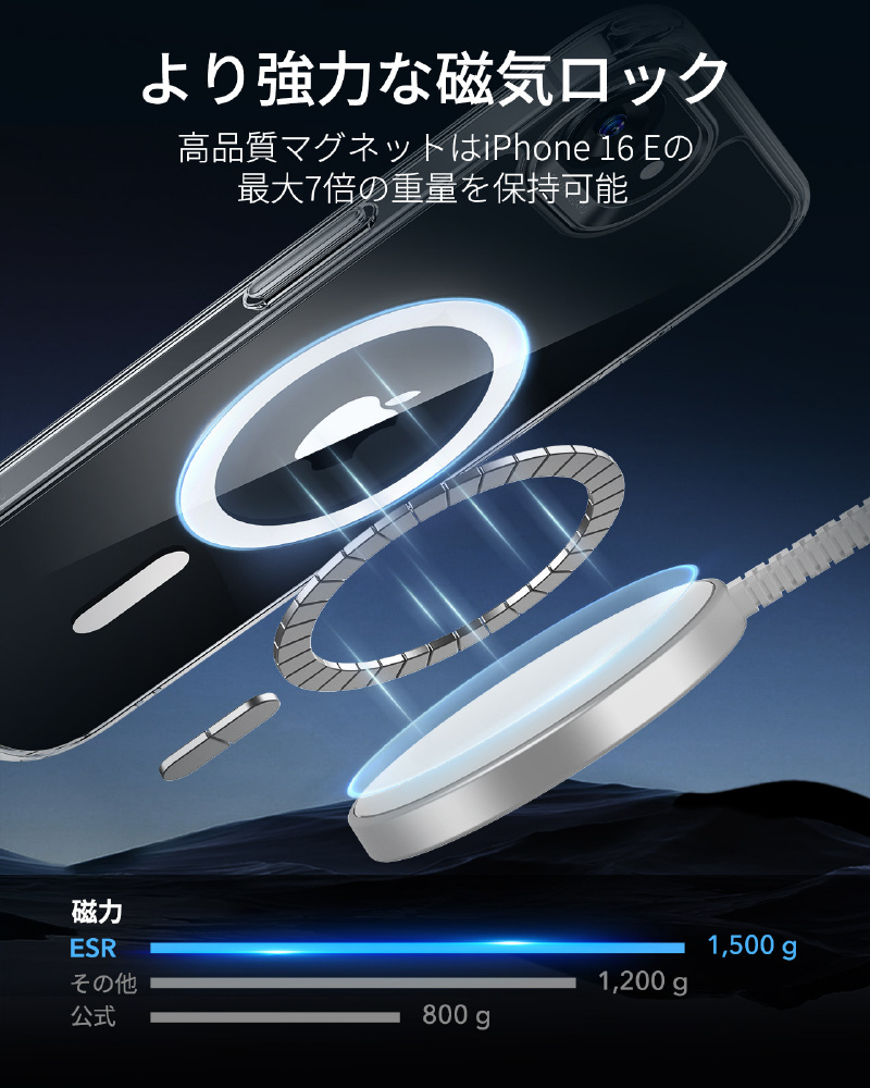 1,500gの保持力を持つ強力な内蔵マグネットは、より速く、より簡単な瞬間吸着ワイヤレス充電を可能にし、あらゆるMagSafeアクセサリーに安全なロックを提供します。このiPhone 16eケースは、iPhone 16e MagSafeアクセサリーを使用する方に最適です