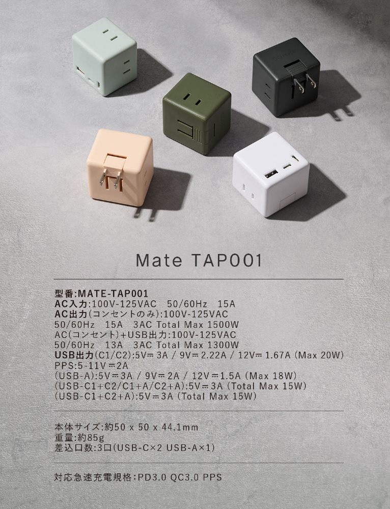商品名 PD20W Mate TAP 001 Type-C×2、USB-A×1 ライトブラック MATE-TAP001-LBK