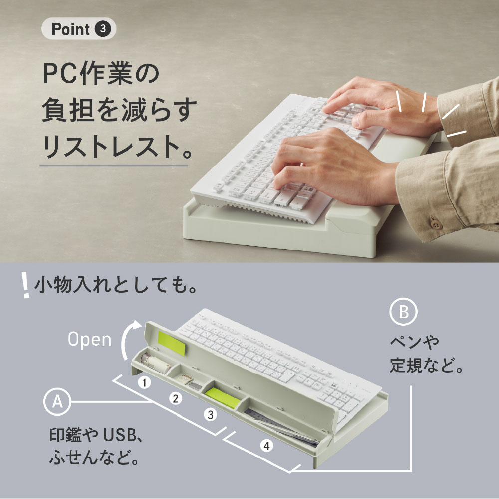手首が疲れにくいリストレスト付きで、リストレストには文具などが入る小物入れが付いています。