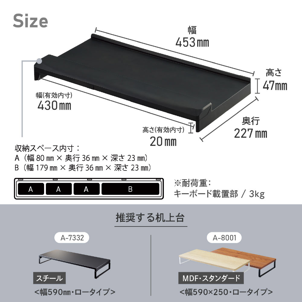 幅450×奥行き155mmまでのテンキー付きフルサイズキーボードを載せて使えます。