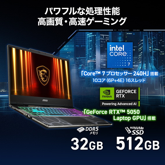 「GeForce RTX 5050 Laptop GPU」を搭載しつつ、本体重量を2kg以下に抑え、室内を移動する際の持ち運びやバックパックへ収納して外出先へ気軽に持ち運ぶことが可能になっています。また、コンパクト設計のためデスク上でパソコンを設置するスペースを節約することができ、扱いやすいデザインになっています。