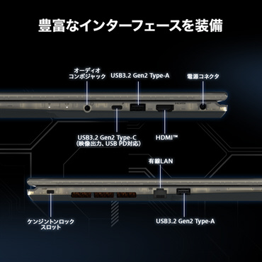 この他、USB Type-C、Type-AやHDMI、有線LANなどゲーミングに必要な各種ポートを備えており、変換アダプタ不要で様々なデバイスを接続でき、ゲーミング・ビジネス・クリエイティブなどあらゆる場面で高いユーザービリティを発揮します。