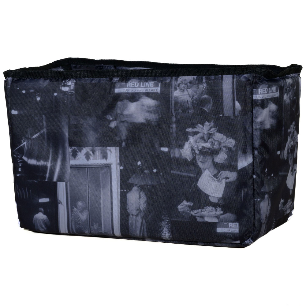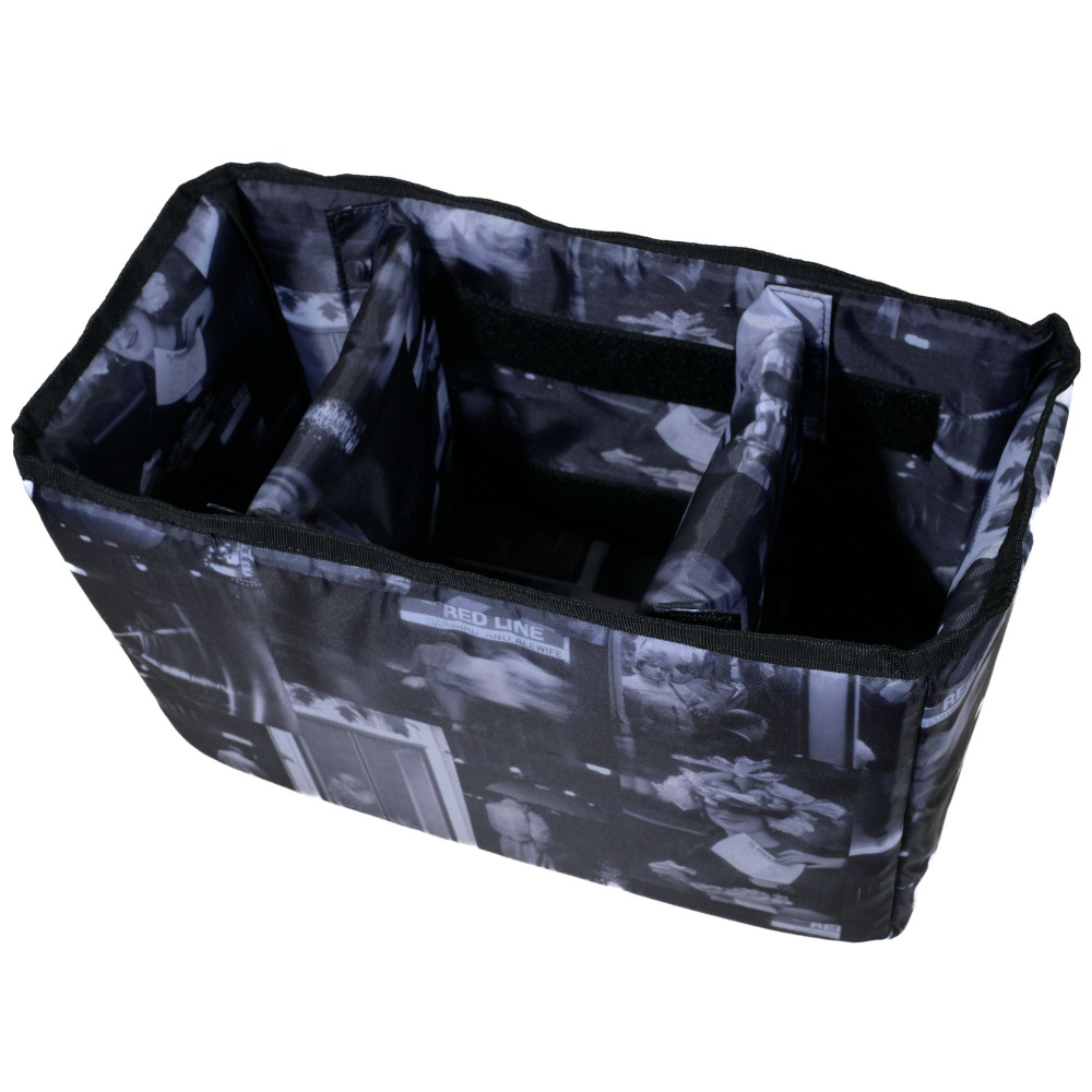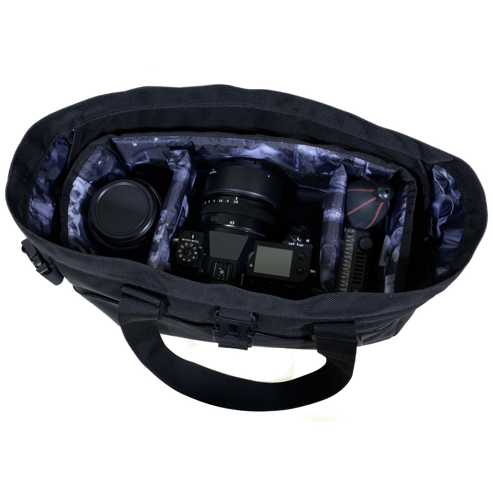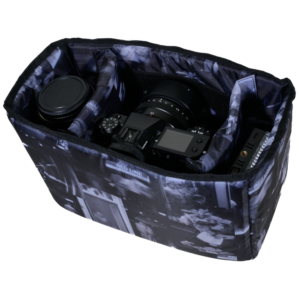 面ファスナーで位置調整ができる便利な間仕切りの付いた、厚手のクッションパッド入りインナーバッグを標準装備。インナーバッグ素材のオリジナルプリント柄は、織作氏のカメラマンの原点とも言える写真集「BOSTON in the time」より。