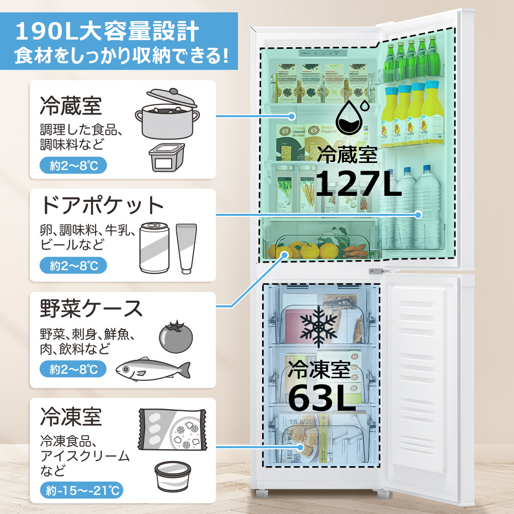 ●総容量は190L、冷凍室63L、冷蔵室127Lで、週末の買い物もまるごと収納可能。