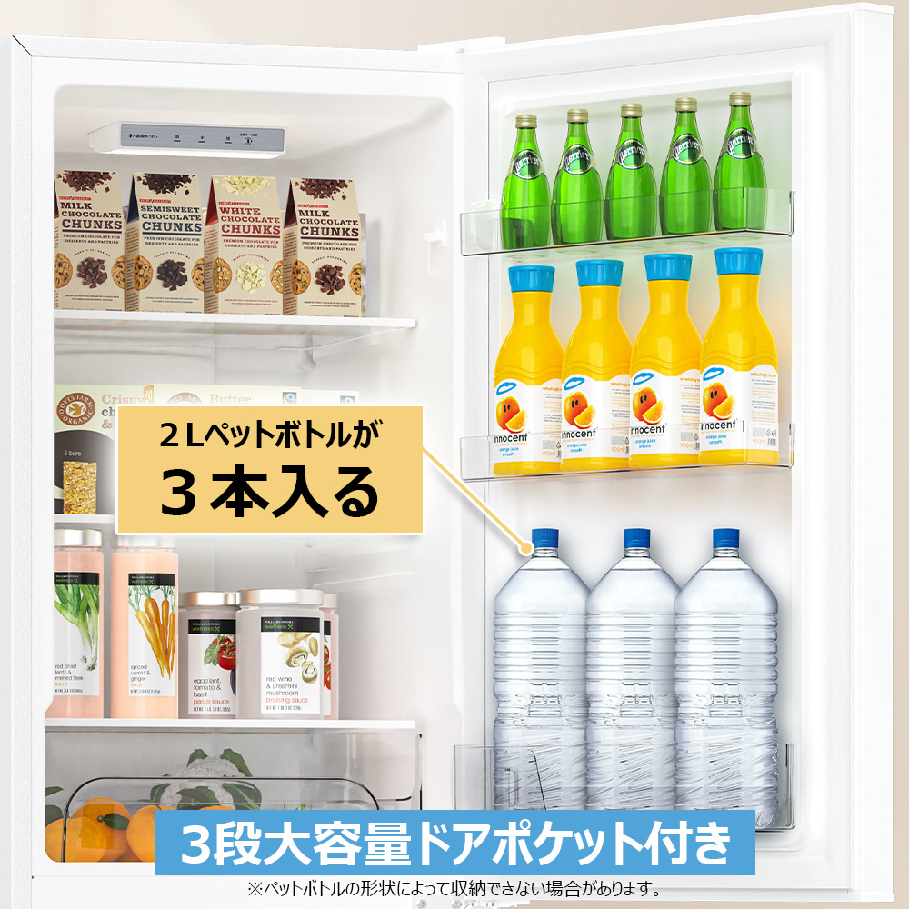 ●収納しやすい3段ドアポケットを活用することで、瓶やペットボトルをすっきり整理できます。