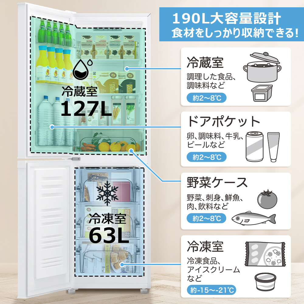 ●総容量は190L、冷凍室63L、冷蔵室127Lで、週末の買い物もまるごと収納可能。