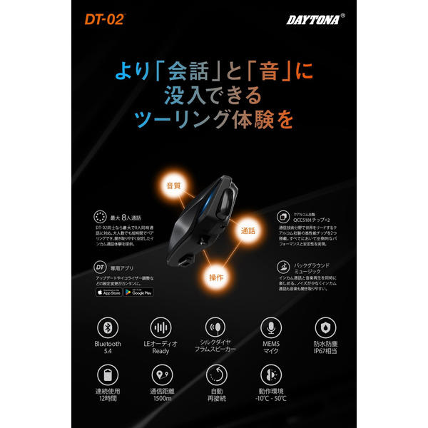 DT-02同士なら最大で8人同時通話に対応。大人数でも短時間でペアリングでき、聞き取りやすく安定したインカム通話体験を提供。