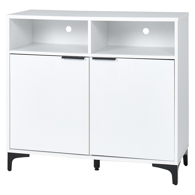 木目調の本体とアイアンの脚部のコンビがおしゃれなキャビネット(幅90cm)。すぐに取りたいものを置けるオープン部と生活感をスッキリ隠せる扉収納が魅力的。