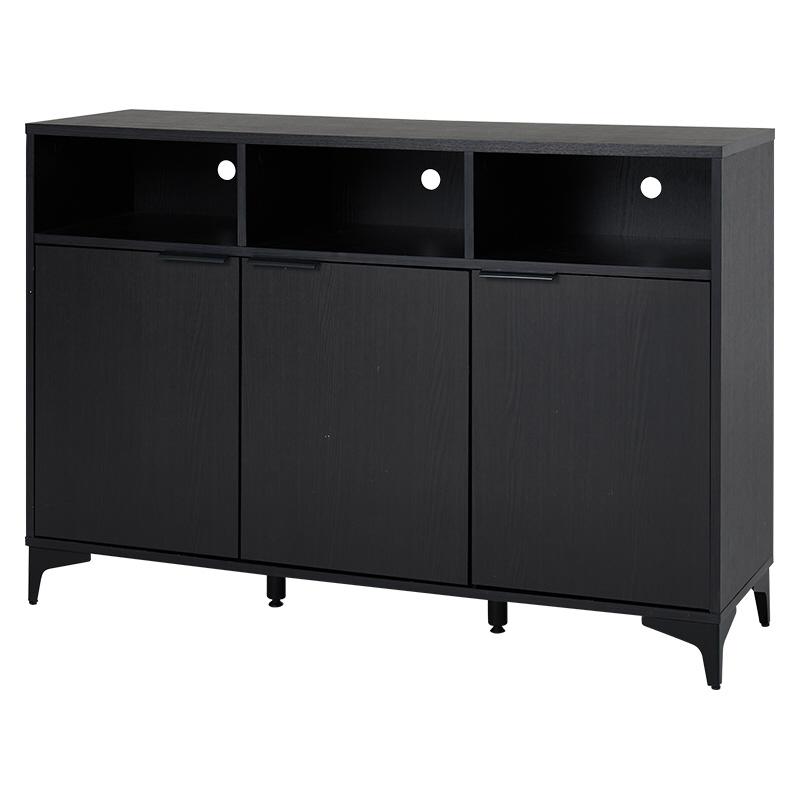 木目調の本体とアイアンの脚部のコンビがおしゃれなキャビネット(幅120cm)。すぐに取りたいものを置けるオープン部と生活感をスッキリ隠せる扉収納が魅力的。