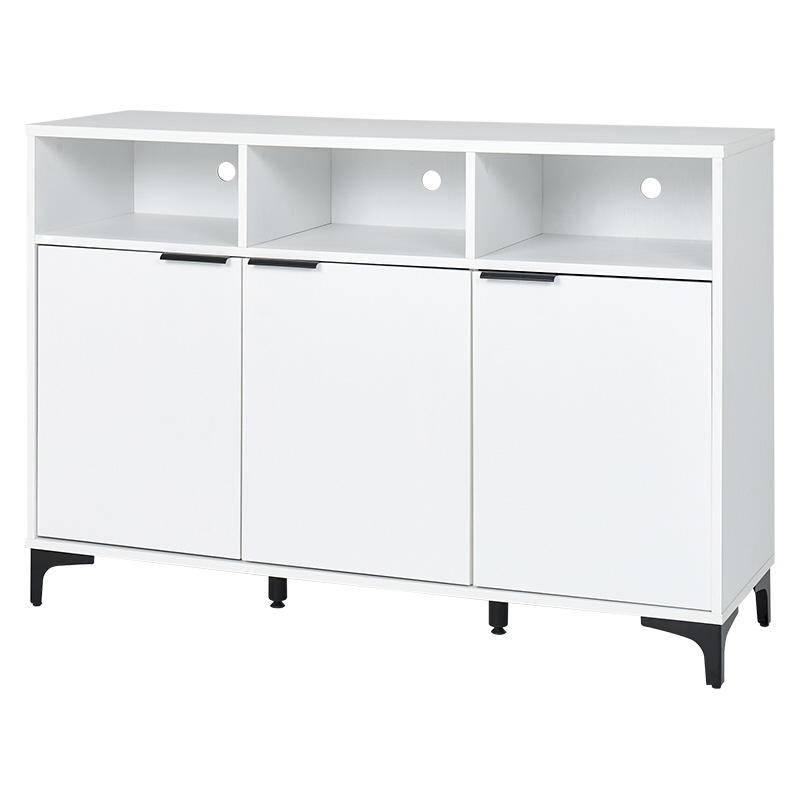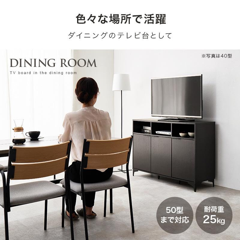 木目調の本体とアイアンの脚部のコンビがおしゃれなキャビネット(幅120cm)。すぐに取りたいものを置けるオープン部と生活感をスッキリ隠せる扉収納が魅力的。