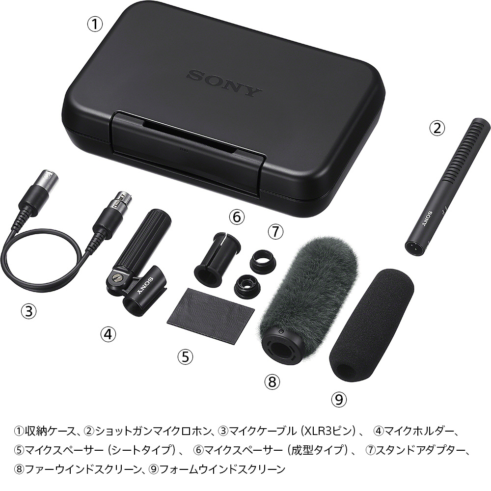 | 仕様3 | 同梱品:フォームウインドスクリーン (1) ファーウインドスクリーン (1) マイクホルダー (1) マイクスペーサー (成型タイプ) (1) マイクスペーサー (シートタイプ) (1) マイクケーブル (1) 収納ケース (1) スタンドアダプター (2) |