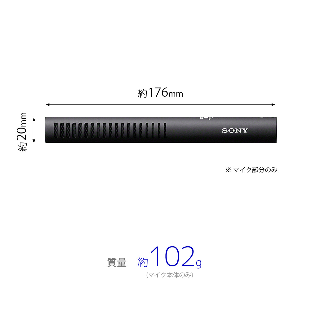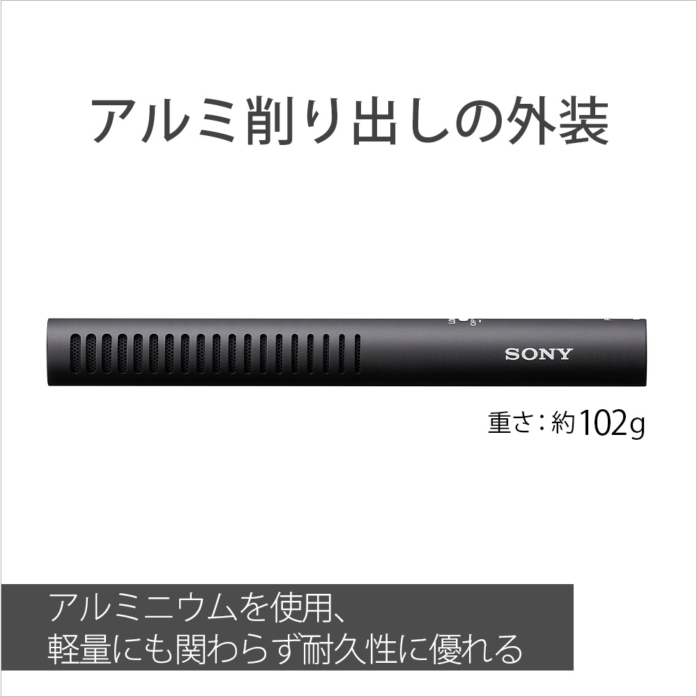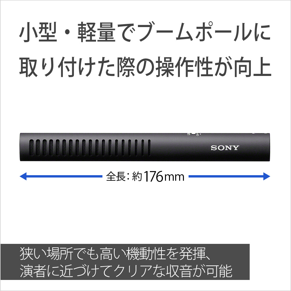 全長176mm、重量102gと小型軽量ながら、優れた前方鋭指向性を実現することで狭い場所での収録時などに高い機動性を発揮します。